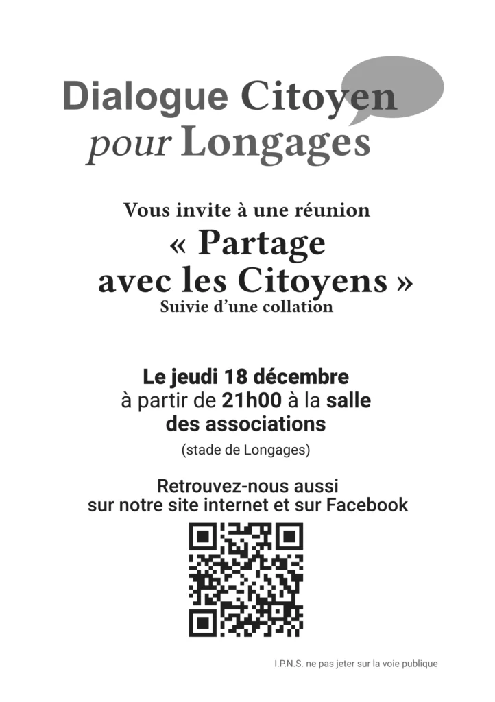 Le jeudi 18 décembre, à partir de 21h à la salle des associations, nous seront présents pour un moment conviviale lors d’une réunion de partage avec vous tous Longagiens. Le but de cette réunion est de partager vos besoins et vos envies sur le village.